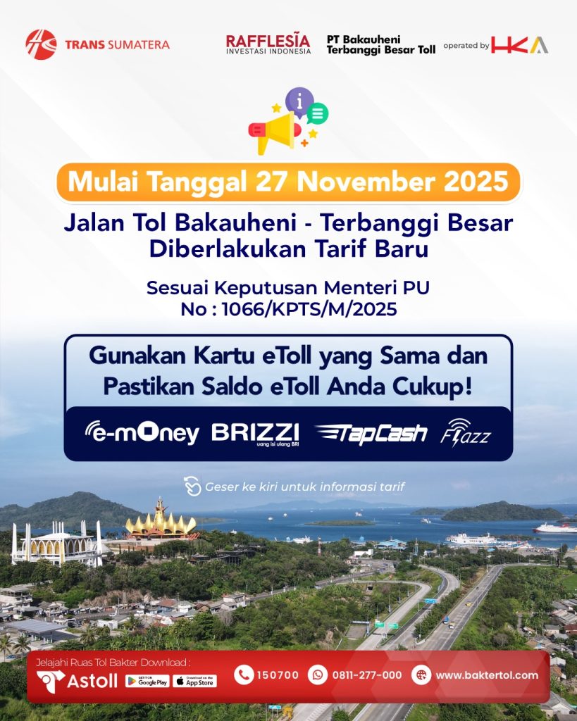 Pemerintah bersama pengelola PT Bakauheni Terbanggi Besar Toll Road (Hutama Karya) resmi memberlakukan penyesuaian tarif tol untuk ruas Bakauheni – Terbanggi Besar (Bakter), Lampung, yang mulai efektif pada akhir November 2025. Penyesuaian tarif ini dilakukan sebagai bagian dari peningkatan kualitas layanan jalan tol Trans Sumatera. Ruas tol Bakter merupakan jalur utama yang menghubungkan Pelabuhan Bakauheni […]